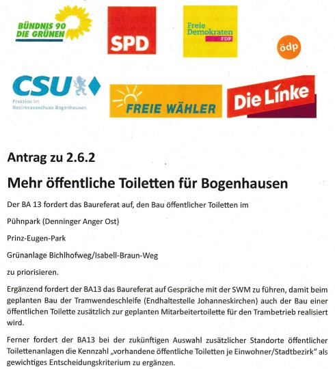 Es ist nicht weiter hinnehmbar, dass ein großer Außenbezirk, was öffentliche Toiletten angeht, derart unterversorgt ist. Wir fordern ein Gegensteuern der Stadt München, da es sich hier klar um eine notwendige Infrastruktur der Daseinsvorsorge handelt. Gerade für Familien mit kleinen Kindern und für ältere Mitbürger und Mitbürgerinnen sind fehlende Toiletten ein Problem. Anwohnende an stark genutzten Grünanlagen beschweren sich zurecht über das „Wildpieseln“. Alle oben geforderten Standorte liegen in attraktiven, sehr gut besuchten Grünanlagen. Wir würden uns wegen der angespannten Haus-haltsanlage wünschen, dass alternative Finanzierungs- und Unterhalts-konzepte entwickelt werden,die den Bau zusätzlicher Toilettenanlagen beschleunigen.